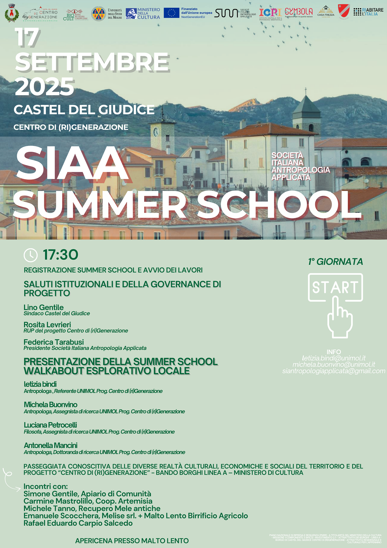 Si inizia mercoledì 17 settembre, alle ore 17.30, nella sala meeting dell’albergo diffuso Borgotufi con l’accoglienza dei 19 scritti alla Summer School da parte del sindaco di Castel del Giudice, Lino Gentile, della presidente della SIAA, Federica Tarabusi e della Responsabile Unica di Progetto, ing. Rosita Levrieri. A coordinare i lavori dell’incontro e dell’intera Summer School, Letizia Bindi, membro del Direttivo SIAA e referente per l’Università del Molise del progetto Castel del Giudice Centro di (ri)Generazione dell’Appennino. I lavori delle cinque giornate di scuola estiva saranno presentati con l’aiuto delle ricercatrici Michela Buonvino, Luciana Petrocelli e Antonella Mancini. Seguirà un walkabout attraverso il paese che darà la possibilità di incontrare i testimoni delle diverse realtà in trasformazione e innovazione nel quadro progettuale: le cooperative di comunità, le associazioni, le imprese agricole locali, le attività turistico-ricettive, le realtà connesse all’inclusione sociale e culturale. Le giornate del 18 e del 20 saranno dedicate al territorio, con Study Visit nei comuni di Carovilli, Capracotta ed Agnone volti ad approfondire con il coinvolgimento attivo di testimoni delle comunità locali, tematiche relative ai Tratturi, alla pastorizia, alla Transumanza e al lavoro a base culturale come leva di sviluppo nei contesti rurali e marginali. Le energie rinnovabili e i loro impatti sociali e culturali saranno al centro del workshop del 19 settembre a Castel del Giudice, la cui cittadinanza si è resa protagonista della costituzione della CER – Comunità Energetica Rinnovabile, che vede l'adesione di oltre 70 cittadini come "consumatori virtuali" dell'impianto fotovoltaico installato nell'area industriale comunale. L'obiettivo è fornire benefici ambientali, economici e sociali attraverso l'autoconsumo di energia rinnovabile, contribuendo alla riduzione delle emissioni di gas serra e all'indipendenza energetica del paese. Il 21 settembre l’evento finale a Castel del Giudice con riepilogo e sintesi delle attività, ritorno sulle esperienze e letture incrociate con i partecipanti ed aperitivo di commiato.