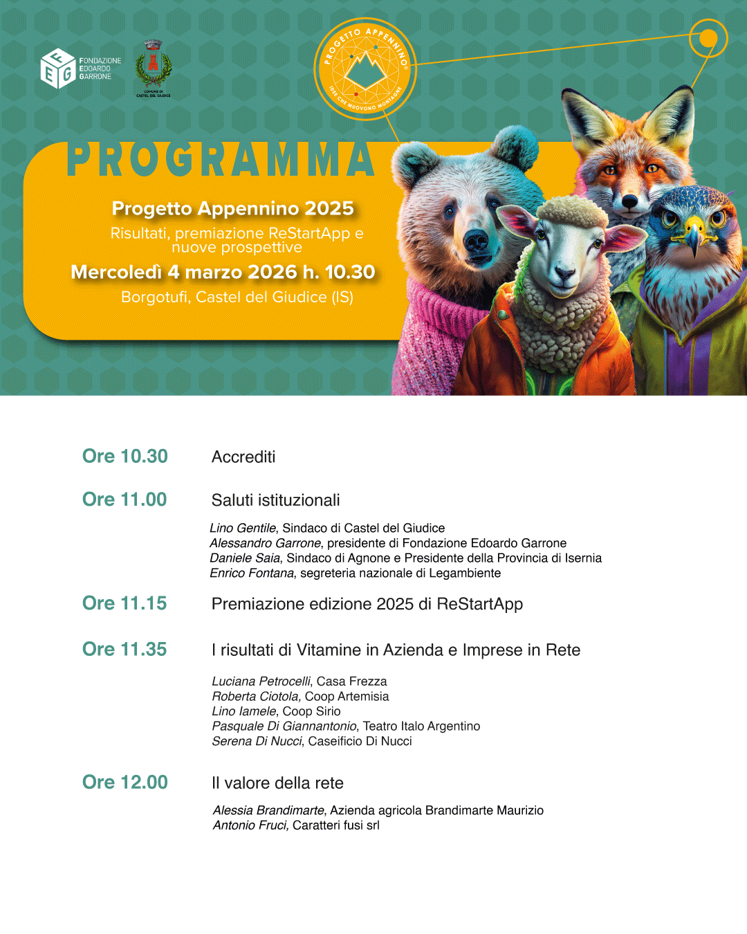 Mercoledì 4 marzo 2026, alle 10:30, nella sala meeting di Borgotufi a Castel del Giudice, saranno premiati i migliori progetti d’impresa dell’edizione appena conclusa del Campus ReStartApp. Verranno inoltre presentati i percorsi e i risultati raggiunti dalle aziende coinvolte nei programmi Vitamine in Azienda e Imprese in Rete, insieme ai nuovi bandi di Progetto Appennino 2026.
