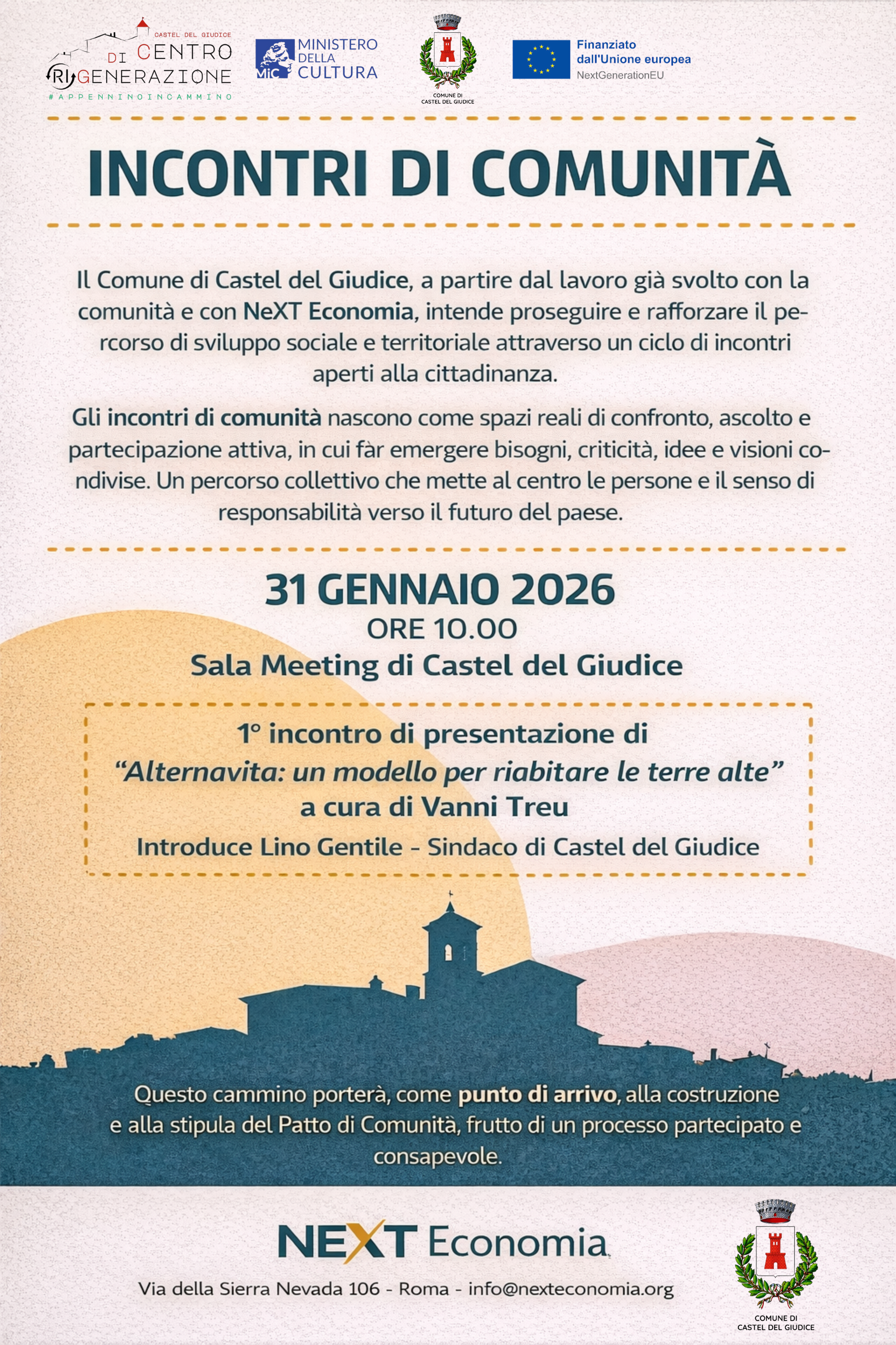 Rafforzare il tessuto sociale del paese, contrastare lo spopolamento, creare le condizioni affinché chi è nato a Castel del Giudice (IS) possa scegliere di restare e consolidare l’attrattività del territorio per favorire l’arrivo di nuovi abitanti: con questo obiettivo nasce il Progetto “Ri-Abitare Castel del Giudice” che prenderà il via sabato 31 gennaio 2026 alle ore 10.00 nella Sala meeting di Borgotufi, rivolto a tutta la cittadinanza e aperto a chiunque – giovani, famiglie, associazioni, amministratori – abbia voglia di contribuire con idee, esperienze e punti di vista, in un clima di collaborazione per la salvaguardia del bene comune. Il primo incontro di presentazione “AlternaVita: un modello per riabitare le terre alte” sarà a cura di Vanni Treu con l’introduzione del sindaco Lino Gentile.