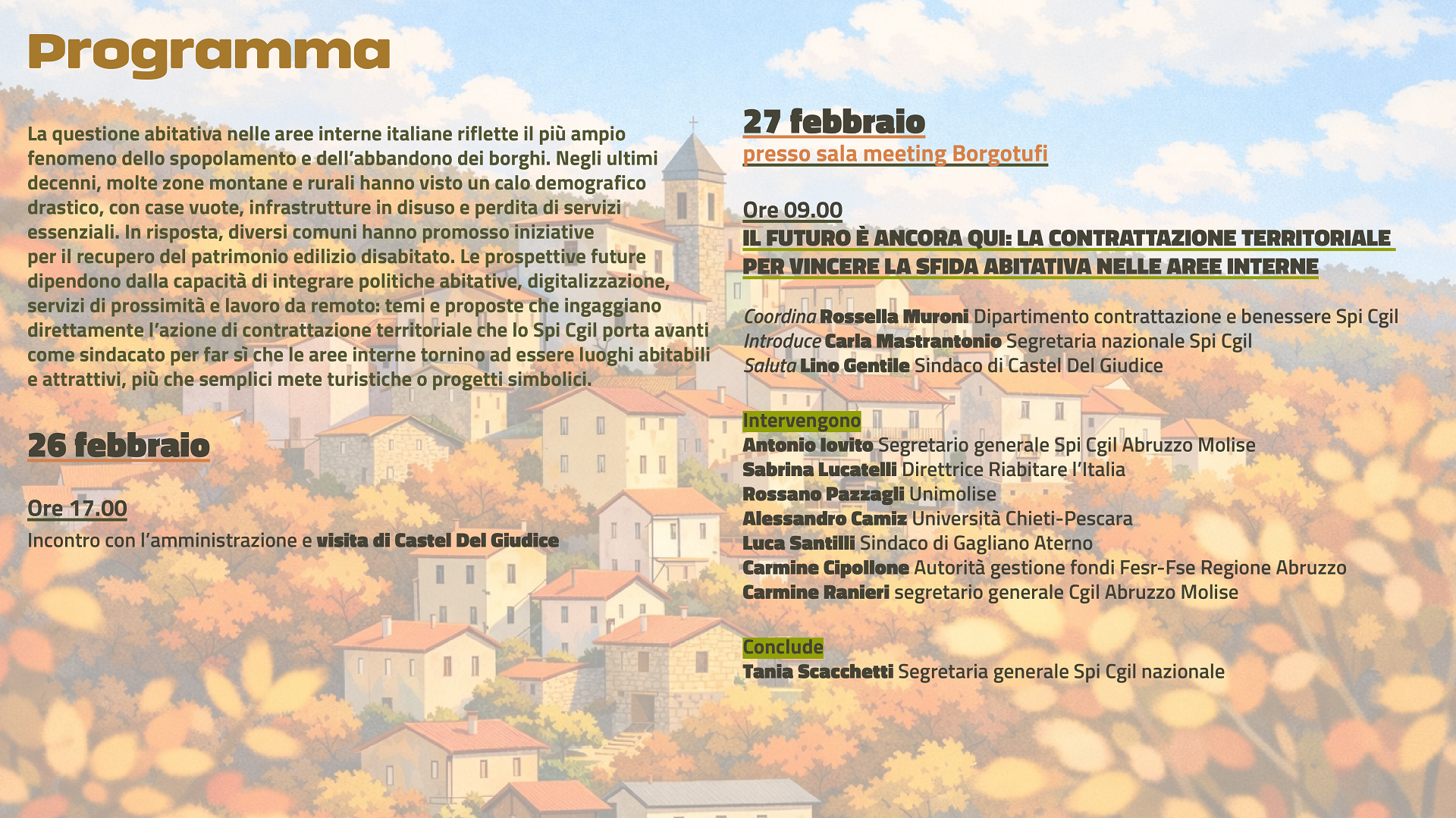 Giovedì 26 febbraio alle ore 17.00, è previsto un incontro con l’amministrazione comunale e una visita guidata del borgo, per conoscere da vicino il percorso di rigenerazione che ha reso Castel del Giudice un caso di studio a livello nazionale. Venerdì 27 febbraio, dalle ore 9.00, nella sala meeting dell’albergo diffuso Borgotufi, si terrà la sessione di lavoro aperta al pubblico e coordinata da Rossella Muroni del Dipartimento Contrattazione e Benessere dello SPI CGIL, con l’introduzione di Carla Mastrantonio, Segretaria nazionale SPI CGIL. Dopo i saluti del Sindaco di Castel del Giudice Lino Gentile, si proseguirà con gli interventi di Sabrina Lucatelli, Direttrice di Riabitare l’Italia; Rossano Pazzagli, Professore dell’ Università del Molise esperto di politiche delle aree interne; Alessandro Camiz, Professore dell’Università “G. d’Annunzio” di Chieti-Pescara esperto in rigenerazione sostenibile dei tessuti storici; Luca Santilli, Sindaco di Gagliano Aterno; Carmine Cipollone, Autorità di gestione fondi FESR-FSE Regione Abruzzo; Antonio Iovito, Segretario generale SPI CGIL Abruzzo Molise. Le conclusioni saranno affidate a Tania Scacchetti, Segretaria generale nazionale SPI CGIL.
